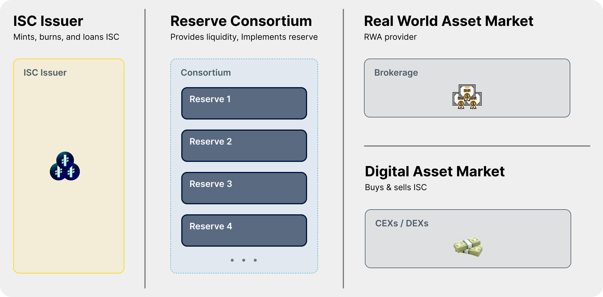 Each reserve is tasked with providing liquidity of ISC to the Digital Asset Market, while also buying and selling assets from the Real World Asset Market.